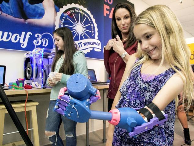 With family members occasionally shouting “Be careful” and “Watch out for that car,” Faith firmly placed her new hand’s bright blue and pink fingers on her bike’s left handlebar and took off for a seemingly endless sojourn around the Build It Workspace on Tuesday morning. Inside, just a short time before, that hand had rolled off a 3-D printer that built it overnight.